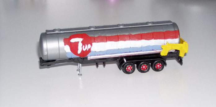 For his tanker bad cop used a diecast tanker trailer made by a French toy company called Mojorette. Extra parts include the back of another toy car by the same company. The trailer is also hand painted.