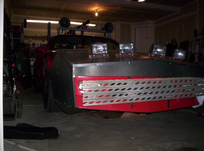 I screwed the sheet metal armor to the hood, and bolted the four headlights on top of that.