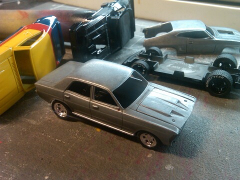 In the first pic (the primered one) a Hot Wheels XB Falcon that is being converted to a 4-door to be more accurate. Not the exact body used but close enough for what we can get. And of course the