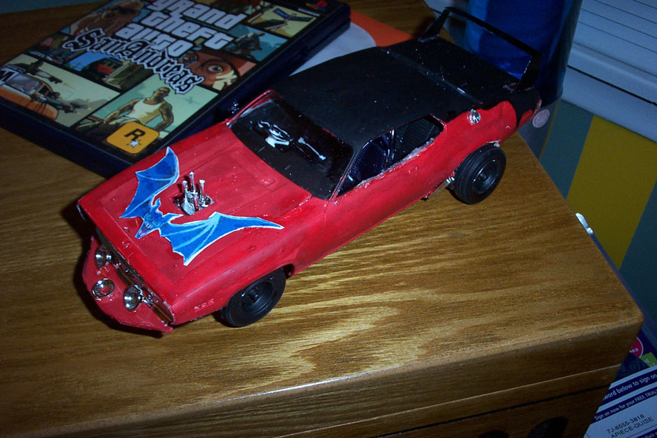 Another replica by Liquid Hamster, based on a Revell 71' GTX. His XA has a scratch built spoiler made of PVC and the nose spoiler is the cut up truck bed cover from my chevy pickup model AKA red f100. The bat artwork on the hood is Dark Horse's design.